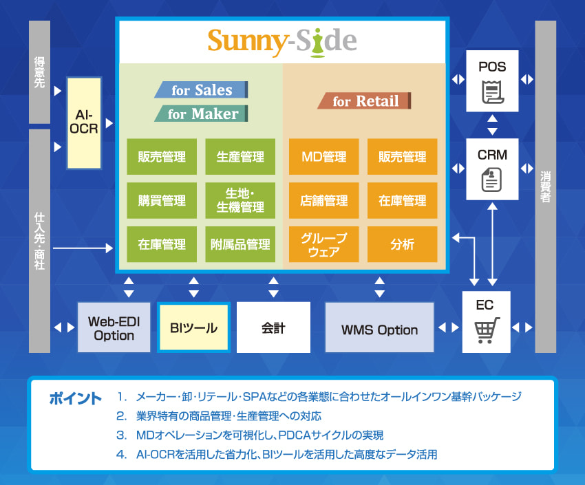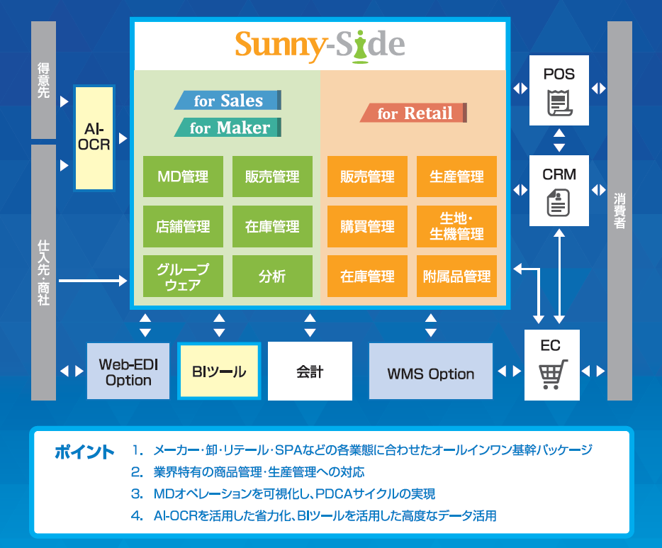 Sunny-Sideは、ファッション・アパレル業の生産から小売まで網羅したオールインワンの機能で幅広い業種(メーカー、卸、リテール、SPA)に対応し、お客様のビジネス拡大と成長をサポートします。