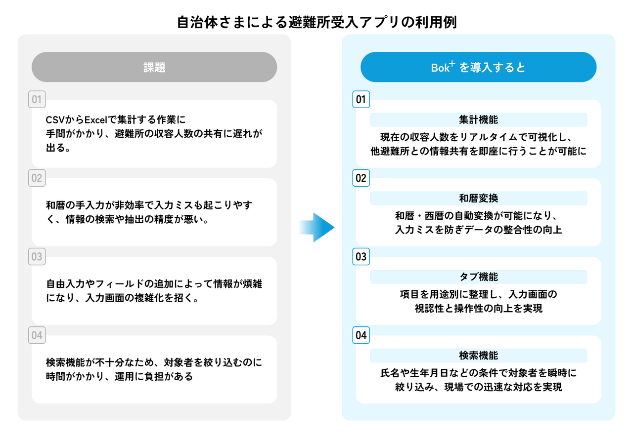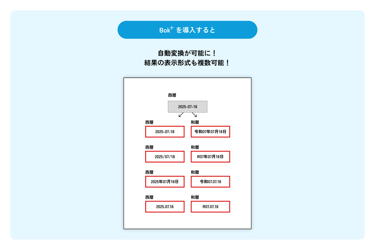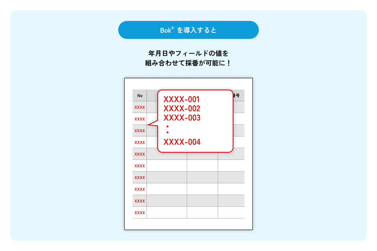 Bok+(Bridge over for kintone拡張版)は、kintoneに保存されたデータから帳票を作成できる帳票出力機能をはじめ、データバックアップや無害化など、kintoneを便利に使うための12機能をまとめて提供するプラグインセットです。