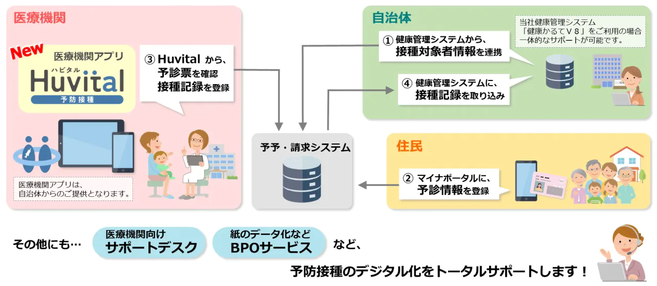 自治体様においては、健康管理システムの改修(標準仕様書3.1版)、医療機関アプリの調達・導入支援、集合契約含む各種契約の締結、