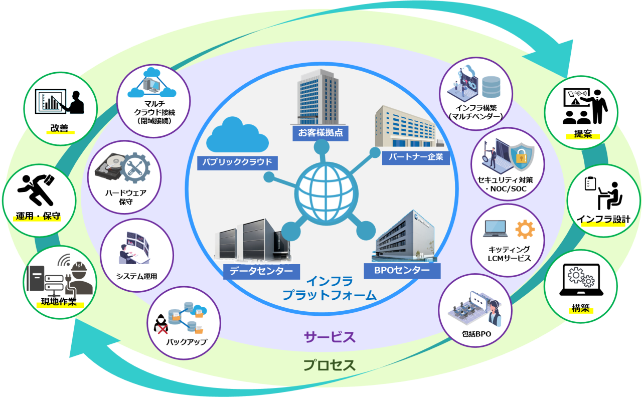 オンプレミス環境、当社データセンター、パブリッククラウド(IaaS等)などを柔軟に組み合わせ、ハイブリッドクラウド環境の構築にも対応可能です。さらに、インフラ構築からハードウェア保守、システム運用、ヘルプデスクまで、一貫したサポートを提供し、お客様やパートナー企業のビジネスを支えます。