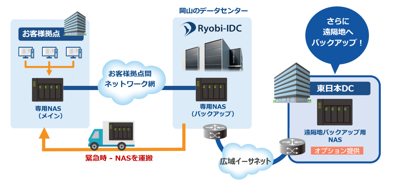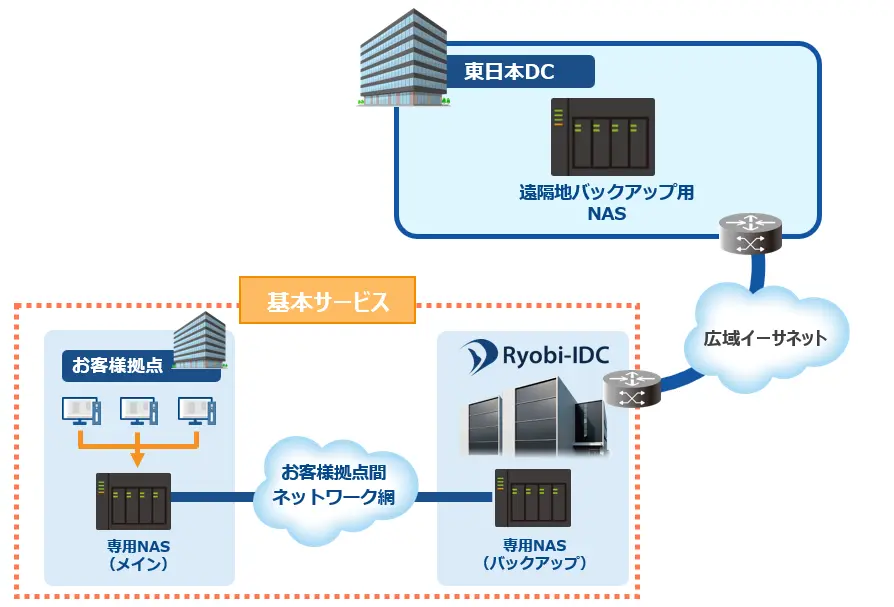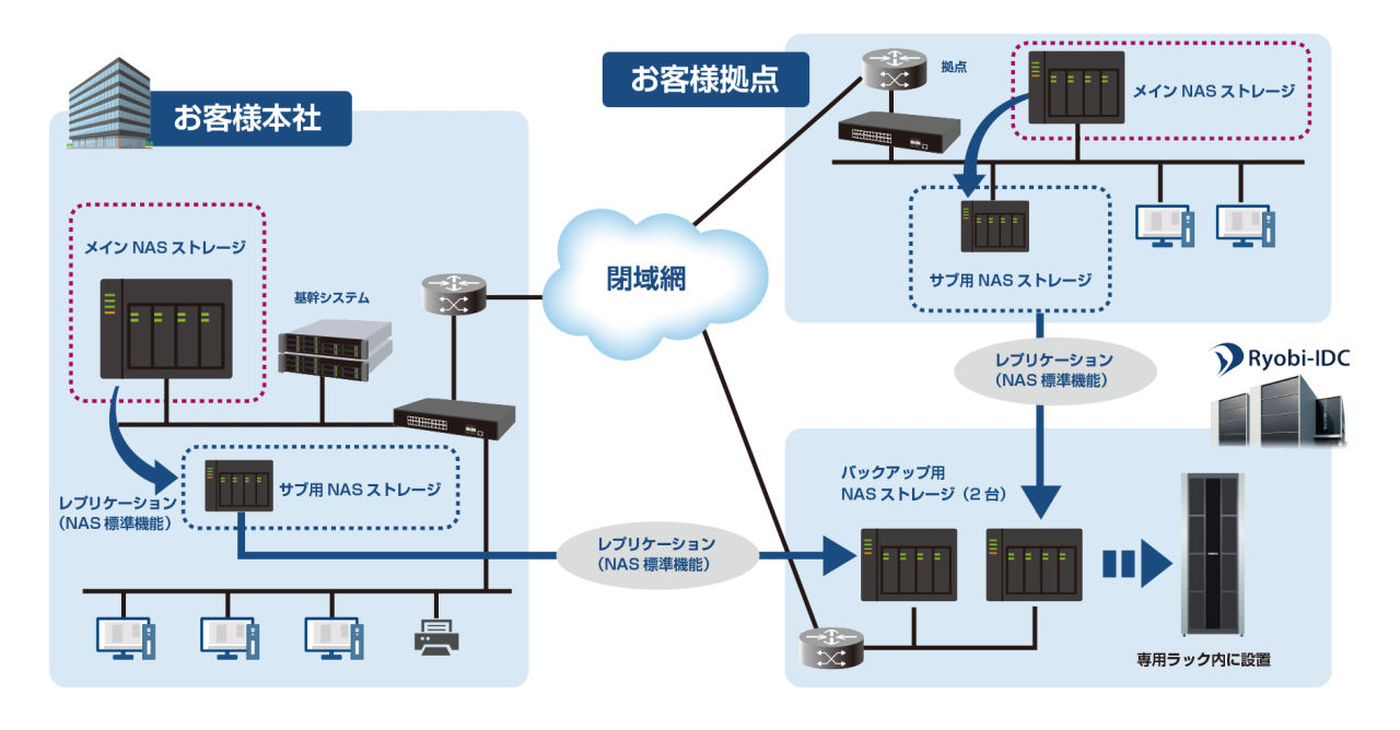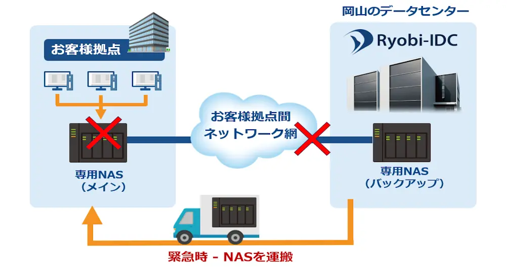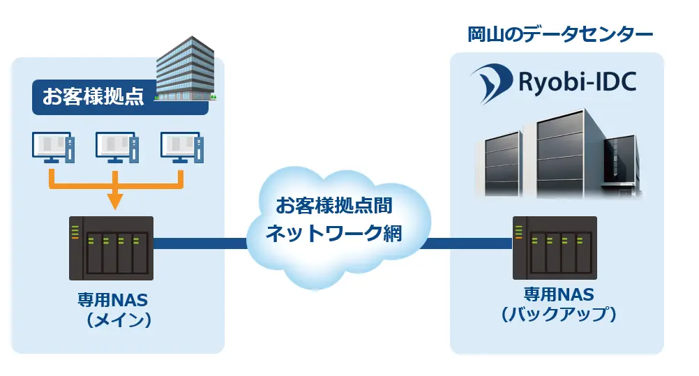 万が一に備え、事業への影響を最小限に抑えるためには計画的なバックアップが不可欠です。Ryobi-IDCのバックアップサービスでは、堅牢なデータセンターにお客様専用のNASストレージをご用意し、安全なデータ保管が可能となります。